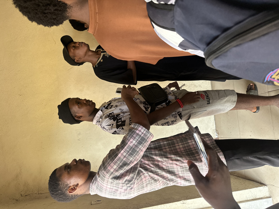 The image captures five individuals standing within an indoor or covered outdoor space in Ihiagwa, Nigeria, against a pale yellow wall