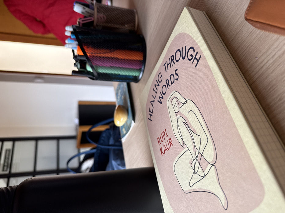 The image captures an indoor, eye-level perspective of a desk setup in Mexico City, Mexico. In the immediate foreground, a closed book titled "Healing Through Words" by Rupi Kaur rests on a light wood-grain surface. Its cover features a light pink background with a minimalist black line drawing of a reclining figure. To the left, a portion of a matte black water bottle is visible. To the bottom right, a corner of a tan or brown object, possibly a wallet or pouch, is present. Behind the book, centrally positioned on the desk, is a black mesh pen holder filled with various colored markers and pens. To its left, a small, smooth, light yellow, ovoid object sits atop a blue-patterned notebook. Further left, a large, dark blue canvas-like bag with two handles is partially visible. The background is intentionally blurred, revealing a white wall to the left and a dark-framed glass partition or door beyond the bag. To the far right, a person wearing a bright red garment is indistinctly visible. No specific actions or interactions are clearly depicted.