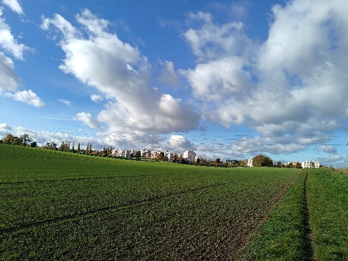 The image depicts an expansive outdoor landscape in Bischheim, France, under a partially cloudy blue sky. The foreground and midground are dominated by a large green field, appearing to be cultivated land with rows of young plants or tilled earth. A narrow, unpaved dirt path runs along the right edge of the field, parallel to a slightly elevated grassy bank. In the background, a line of multi-story residential buildings, primarily light-colored, extends horizontally along the horizon, interspersed with deciduous trees exhibiting autumn foliage. Horizontal power lines are visible stretching across the mid-ground sky, originating from a utility pylon partially visible on the far right. The scene is illuminated by natural daylight, with shadows present on the field. No individuals or specific actions are discernible.