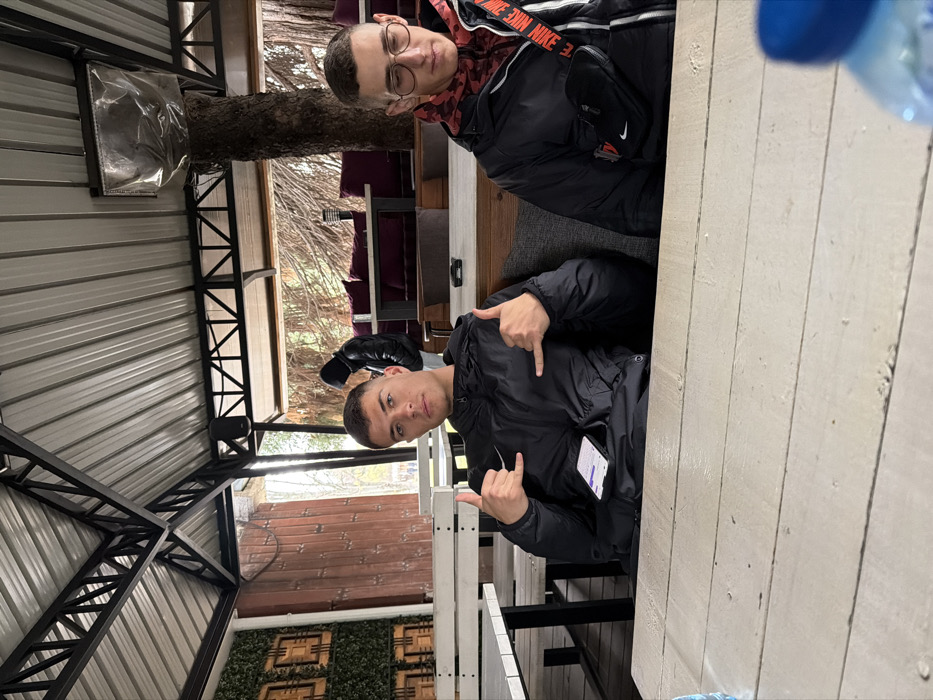 The image portrays two young men seated at a light-colored wooden plank table within a covered outdoor seating area, characterized by a corrugated metal roof supported by black metal trussing. This establishment is located in the city of Sofia, Bulgaria; however, its precise address or name is not discernible from the visual information. In the foreground, the man on the left, with short dark hair, wears a black puffer jacket displaying a white Nike swoosh. He is looking directly at the camera with a neutral expression, performing a "shaka" or "hang loose" hand gesture with both hands. A white smartphone with a dark display is resting on his lap. To his right, a second man with short dark hair and wire-frame eyeglasses wears a black puffer jacket over a red and black camouflage-patterned hoodie. A black fanny pack or crossbody bag, featuring a white Nike swoosh and a strap marked "NIKE," is worn across his chest. He is looking downwards and to his right, not engaging with the camera. Both individuals are seated on dark grey upholstered bench seats. A blue-capped plastic water bottle is partially visible on the table in the bottom right corner. In the mid-ground, a third person in a black hooded jacket is partially visible, facing away from the camera. The environment includes a wall adorned with artificial green foliage and geometric wooden elements on the left. A large tree trunk is integrated into the structure on the right side of the frame, extending upwards through the roof. Beyond the immediate seating area, additional outdoor seating with dark purple cushions and bare tree branches are visible under natural daylight, indicating an open-air setting.