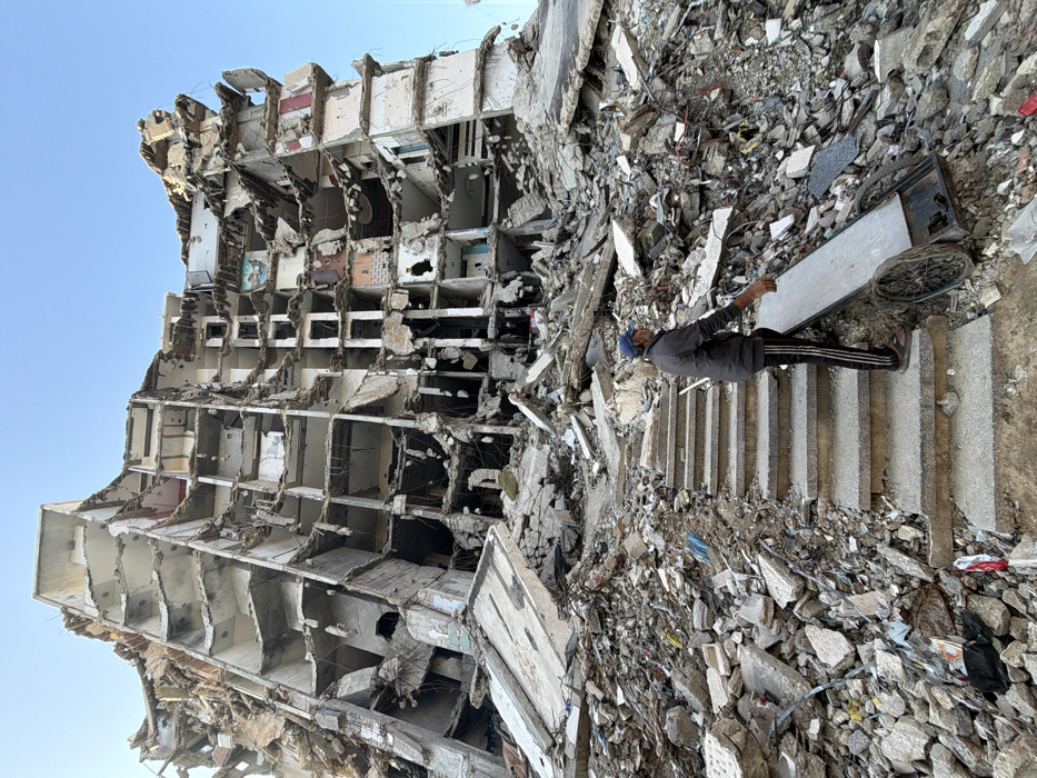 The image depicts a scene of extensive structural devastation in the city of Gaza, Palestinian Territory