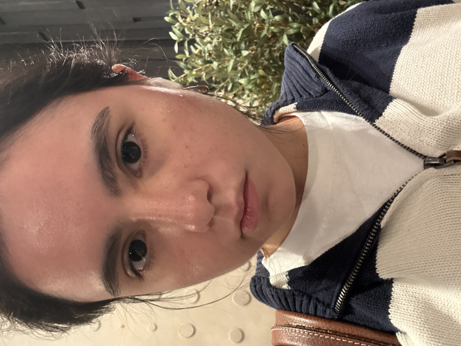 A close-up, slightly rotated, selfie of a person with fair skin, dark hair, and dark eyes. The face is dewy. The person is wearing a white t-shirt and a navy and white striped zip-up sweater. Green foliage is visible in the background. A brown leather bag strap is present on the lower right of the image. The image captures a casual and candid moment.