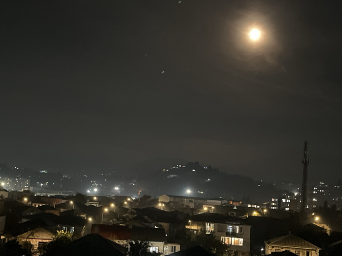 The image presents an elevated nighttime view of Batumi, Georgia. The sky is dark, dominated by a bright, full or near-full moon emitting a distinct halo in the upper right quadrant. Atmospheric haze or light cloud cover is present, particularly around the moon and obscuring distant elements. The cityscape comprises a dense arrangement of low to mid-rise buildings with various roof types, uniformly illuminated by numerous yellow-orange streetlights. Multiple illuminated windows are visible across structures. A tall, slender telecommunication tower, equipped with multiple antenna arrays, stands prominently on the right side of the frame, extending above the city's horizon. Hills or mountains are visible in the background, their contours partially softened by haze, displaying scattered lights from distant dwellings or infrastructure. No individuals, specific actions, or interactions are discernible within the frame.