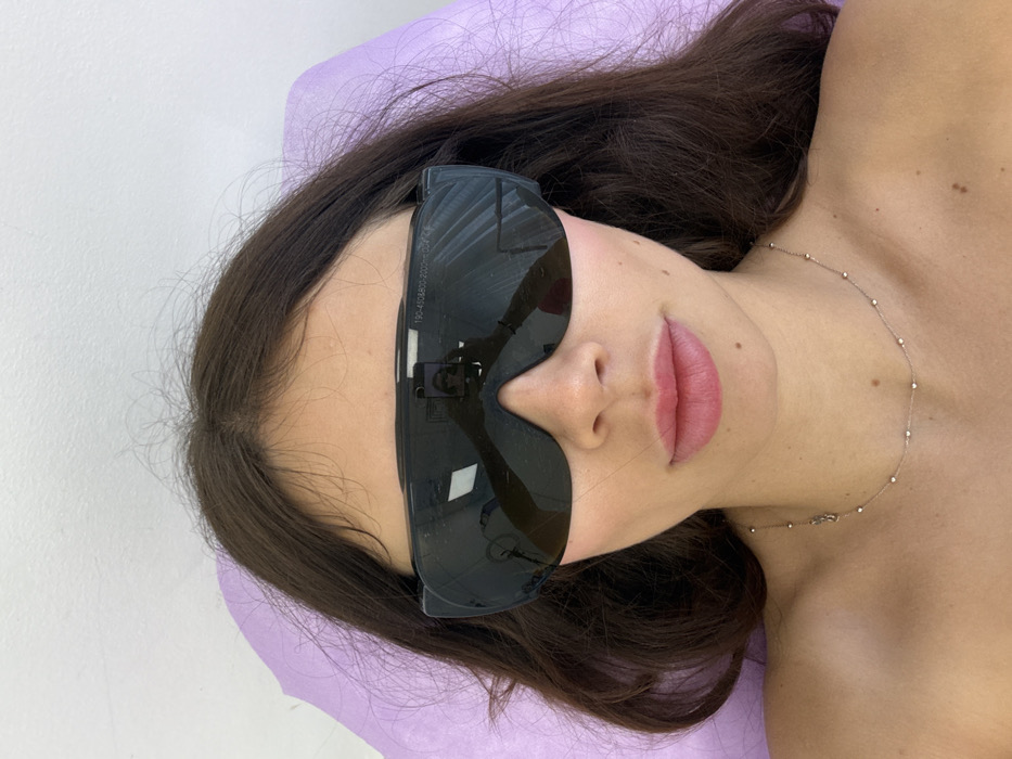 An individual is depicted from the upper chest to the top of the head, lying on their back. The subject is a female with long, dark brown hair parted in the center, and appears to be wearing pink lipstick. She is wearing dark, wrap-around safety glasses, commonly used for laser or intense pulsed light (IPL) treatments, with text "190-450&800-2000nm O.D.7+" visible on the right lens. A reflective surface, likely a smartphone held by the subject's hand, is visible in the reflection on the glasses, indicating a selfie. A delicate silver-colored necklace with small, regularly spaced spherical accents and a small, distinct charm is worn around her neck. She is positioned on a surface covered by a light purple disposable sheet or paper. The background consists of a plain white wall. No visual information within the image confirms the location as Bnei Brak, Israel.