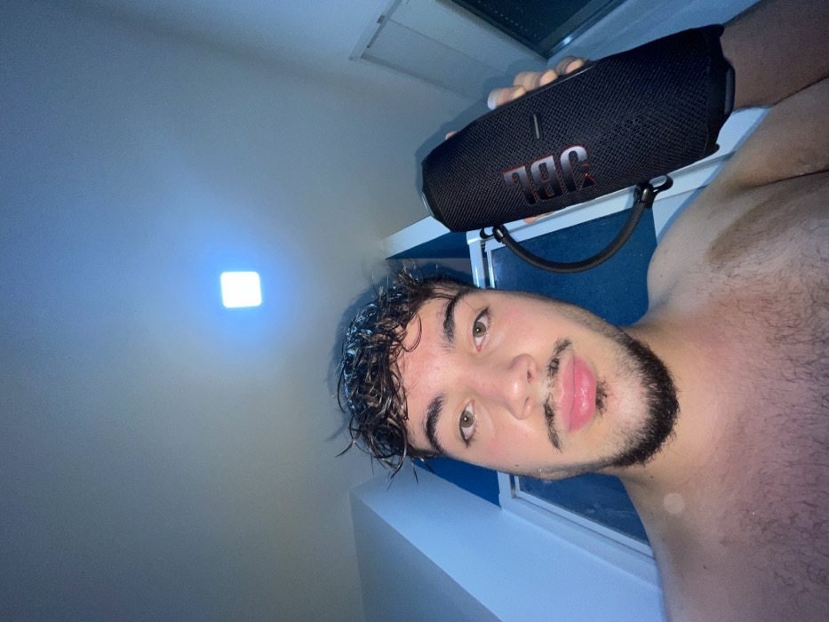 A young adult male, shirtless with wet, dark curly hair and facial hair (mustache and goatee), is depicted in a low-angle selfie
