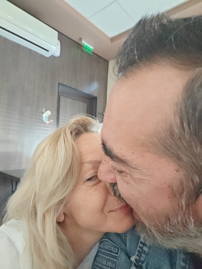 The image displays a close-up, angled view of two individuals indoors. A female subject, characterized by blonde hair and fair skin, occupies the left side of the frame, facing towards the right. She is wearing a white garment. Her right eye is visible, exhibiting periorbital rhytids. A male subject, featuring dark hair, a beard, and a mustache, is positioned on the right, facing towards the left. He is wearing a blue denim jacket with patches on the left shoulder, one of which partially displays the text "DARK SIDE". The individuals' faces are in immediate proximity, with their lips appearing to be in direct contact or imminently so. The background, out of focus, reveals elements of a commercial or public indoor environment. A white wall-mounted air conditioning unit is located in the upper left. Below it, on a gray-brown wall, two small, indistinct decorative objects are affixed. A dark rectangular doorway is visible in the mid-left background. In the upper right background, a green illuminated exit sign is present. A light-colored ceiling with embedded lighting panels is partially visible at the top. The scene takes place within a commercial establishment such as a restaurant, cafe, or hotel in Sofia, Bulgaria. The specific address or precise location within Sofia cannot be determined from the visual evidence.