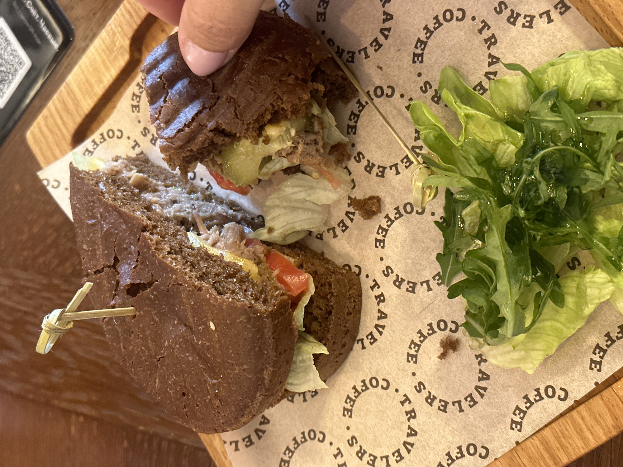 A close-up image depicts a burger or sandwich served on a wooden board with a "TRAVELERS COFFEE" branded paper liner. The burger, constructed with dark brown buns, is cut in half, revealing internal layers of shredded meat, light green lettuce, red tomato slices, and green pickle slices, along with a yellowish sauce or cheese. A decorative bamboo knot pick is inserted into the top bun of the left half. A human hand, featuring fingers with light pink painted nails, holds the right half of the burger, pressing into its textured, grilled surface. To the lower left of the burger, a small side portion of fresh green salad, including arugula, is present. In the upper right background, a dark object with a visible QR code and partial text "Chat. Напитки" is positioned on a wooden table surface. This scene takes place in a "Travelers Coffee" establishment, a chain known to have locations in Surgut, Russia.