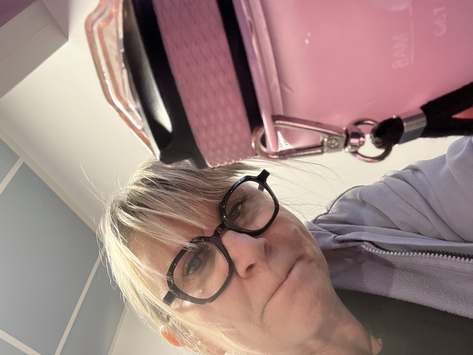 A low-angle selfie shows a woman with short blonde hair and black-framed glasses. She wears a gray zip-up jacket. A pink water bottle is held above her head, featuring a silver clip attached to a black lanyard. Part of a light blue wall is visible in the background. The camera angle emphasizes the woman's face and the water bottle close to the lens.