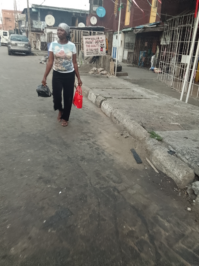 A woman in a patterned t-shirt and black pants walks down a street, carrying a black bag in one hand and a red bag in the other. A car is parked on the side of the street. Buildings line the street, and a sign for a paint depot is visible. The street is paved and shows signs of wear and tear. The woman is walking towards the camera and appears to be the main subject of the photo.