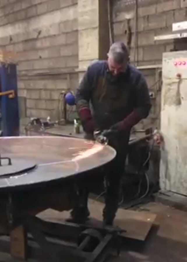 man grinding a large metal disk indoors. The man is wearing dark clothing and gloves. He uses a hand grinder, creating sparks as he moves along the metal surface. The disk rests on a metal frame. The environment looks like a workshop, with brick walls and various tools and equipment scattered around.