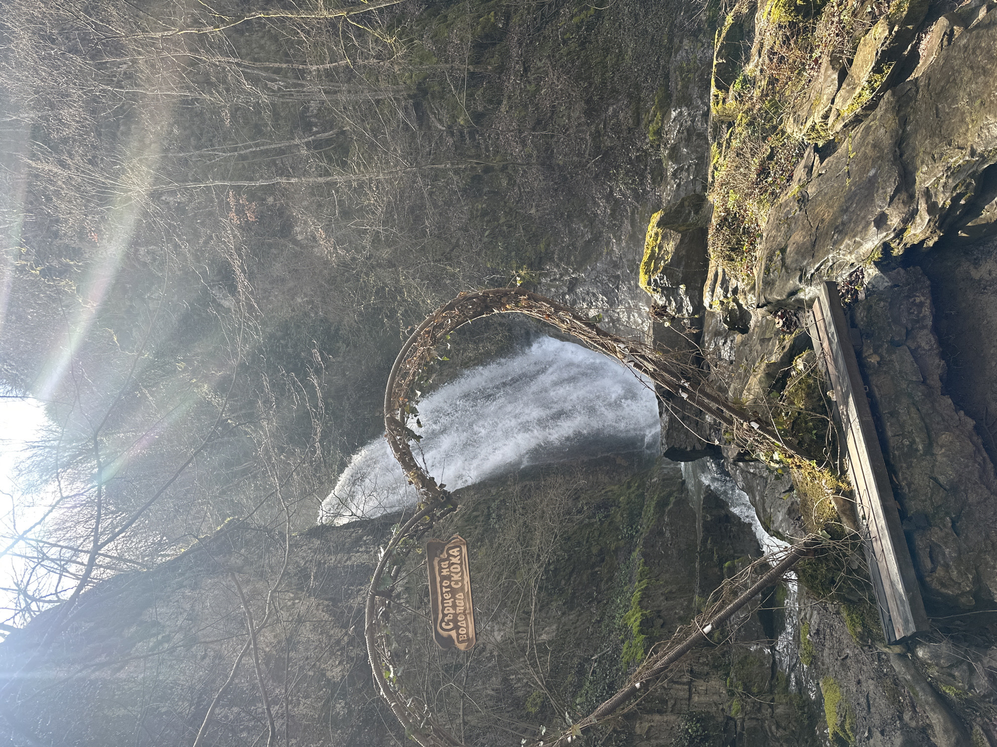 waterfall in a rocky, forested environment. A sign with Bulgarian text is visible in the foreground, partially obscured by vines. The text on the sign reads "Сърцето на водопада Скока" (Sŭrtseto na vodopada Skoka), which translates to "The Heart of Skoka Waterfall." This waterfall is located near Teteven, Bulgaria. The waterfall itself is the main subject, with water cascading down the rock face. The environment includes trees, rocks, and moss, suggesting a natural setting. A constructed wooden plank is adjacent to the rock formation.