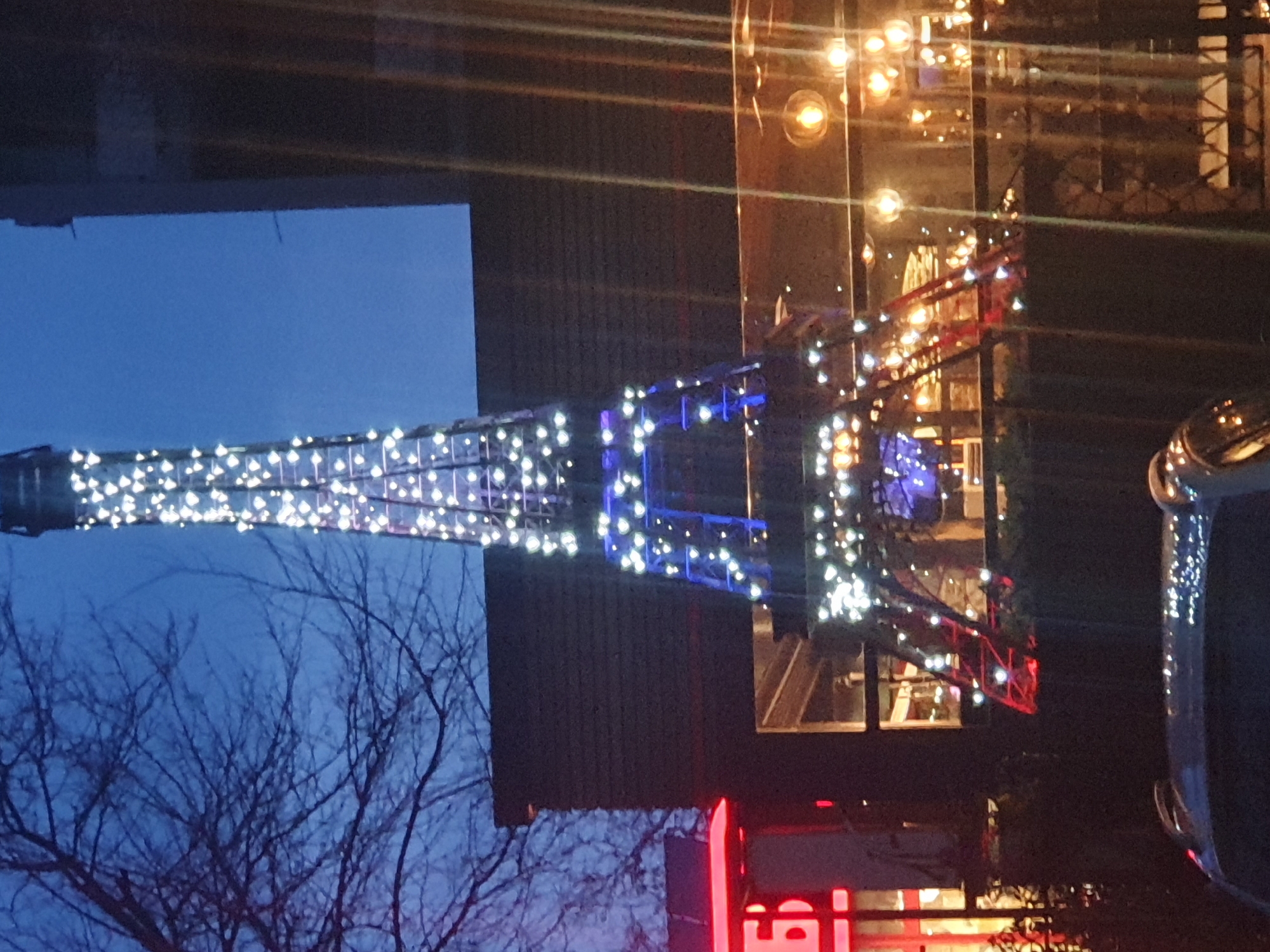 The scene depicts an urban environment at night in Plovdiv, Bulgaria. A large, illuminated replica of the Eiffel Tower stands centrally, adorned with numerous small white lights and prominent blue lights on its lower sections. Directly behind and to the right of the replica, a dark-colored building features a brightly lit interior with multiple amber spherical lamps visible through its large windows. To the left, a building displays a partial red neon sign featuring the Cyrillic character "Б". Bare tree branches are silhouetted against a dark blue sky in the upper left. The top of a dark-colored vehicle, reflecting ambient lights, occupies the lower foreground. No individuals or specific actions are discernible within the frame.