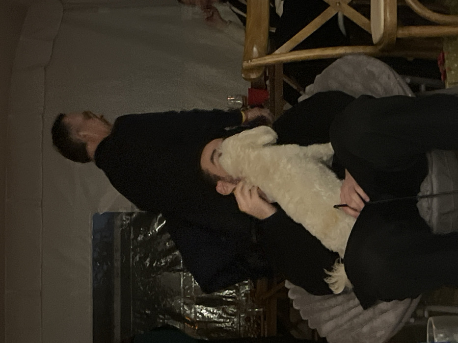 A fair-skinned man in a black shirt and pants is seated on a gray cushion, holding a white poodle-type dog. The dog is close to the man's face, possibly licking or nuzzling him. Part of a wooden chair is visible behind the seated figure. To the left, a wall with insulation material appears to be part of a tent or temporary structure.
