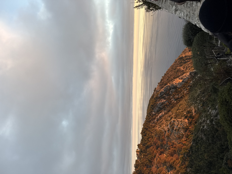 The image presents a panoramic coastal view from an elevated position within the commune of Èze, France, likely overlooking the Mediterranean Sea. The scene is observed during late afternoon or early evening, evidenced by the warm, low-angle sunlight illuminating the western face of a steep, densely vegetated hillside in the mid-ground with a prominent golden-orange glow. Residential structures are discernible on the upper left slope of this illuminated hillside. The sky above is largely overcast with grey clouds, displaying subtle pink and light blue coloration in horizontal bands closer to the horizon. The Mediterranean Sea occupies the middle distance, presenting a calm surface with minor ripples, reflecting the muted colors of the sky. In the immediate lower right foreground, a weathered grey stone wall is visible, behind which a dark-clad individual's head, covered by a dark cap, is partially visible. Sparse green foliage extends from behind the wall.