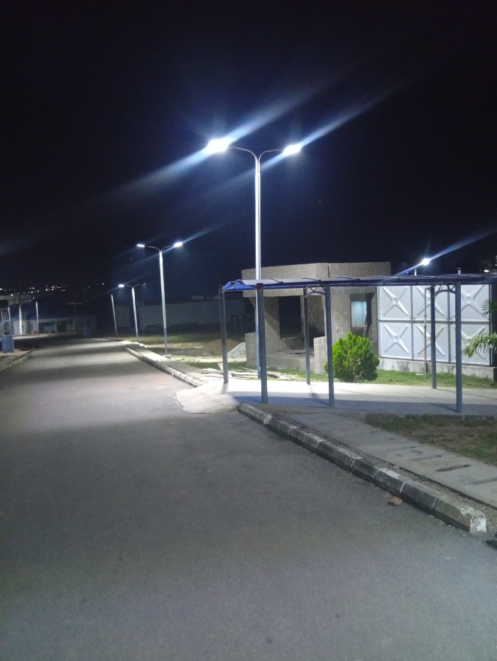 A nighttime view of a dimly lit street with bright street lamps illuminating the scene. The road extends into the distance, lined with sidewalks and curbs. Several structures are visible, including covered shelters or bus stops and a utility building. The sky is dark.