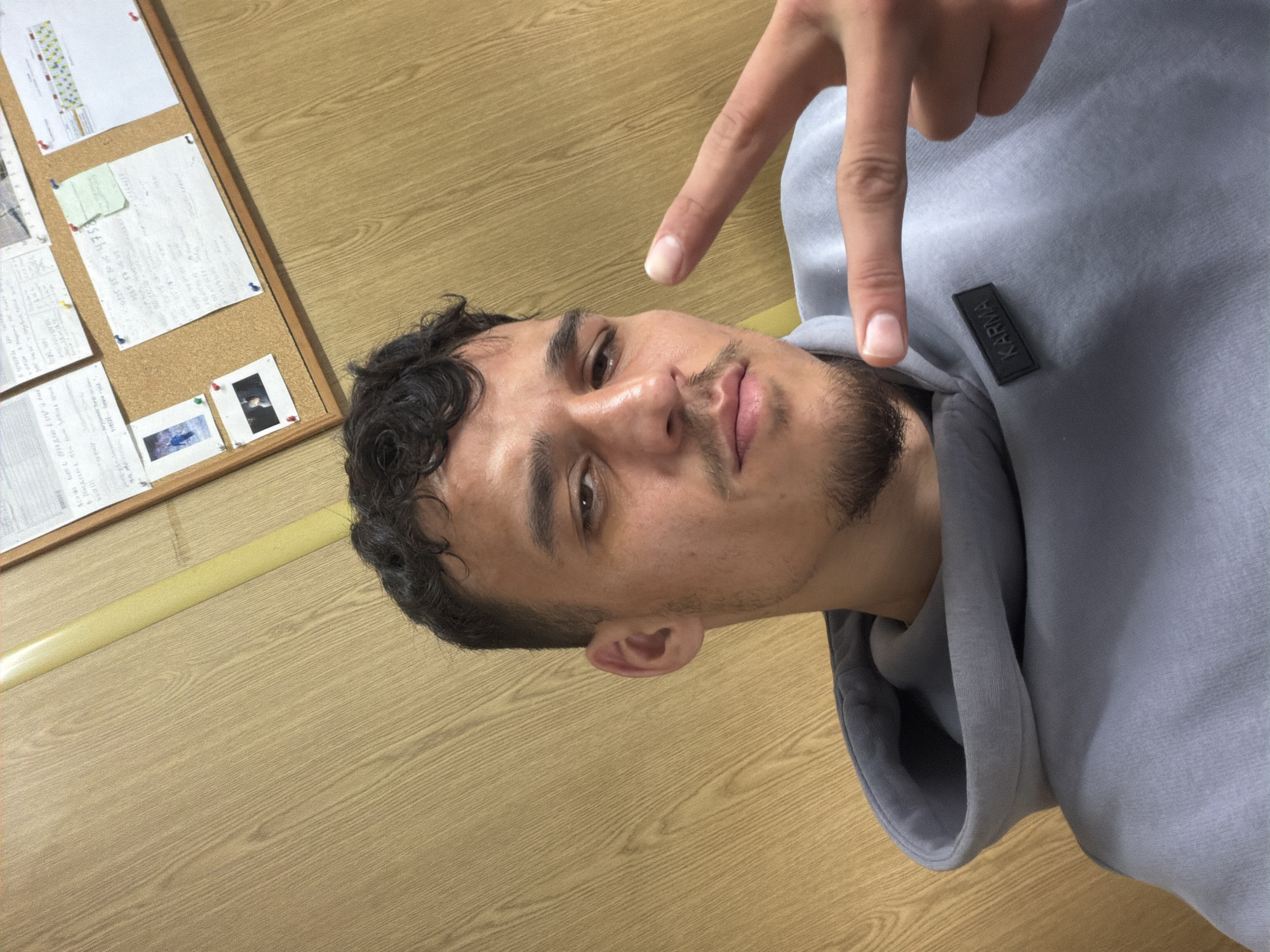 A young adult male is depicted in an indoor selfie photograph, captured from a slightly low angle. The individual has dark, curly hair and light facial hair forming a goatee and mustache. He is wearing a light grey hooded sweatshirt, featuring a black rectangular patch with the word 'KARMA' in white capital letters on the left chest. His right hand is raised, forming a V-sign with the index and middle fingers extended, palm angled towards the camera. The subject maintains direct eye contact with the viewer, exhibiting a subtle smirk. The background features a wall paneled with light-colored wood, exhibiting a vertical grain. A thin yellow vertical strip is visible on the wall to the left of the subject. In the upper right quadrant of the image, a cork bulletin board with a wooden frame is visible, displaying multiple handwritten notes, papers (some in Cyrillic script), and two small photographs, secured by various colorful pushpins. The scene is located in Belozem, Bulgaria.