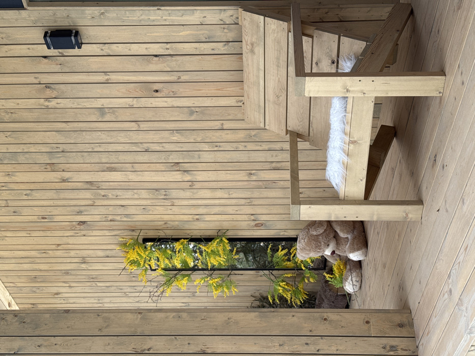 The scene depicts a semi-outdoor, rustic-style area, likely a porch or veranda, located in the city of Mishkino, Russia. The walls are constructed from vertical, light-toned wooden planks, and the floor consists of horizontal wooden planks. In the foreground, right of center, a light-colored wooden lounge chair is present, featuring a low, reclined back and wide armrests. A small, white, fluffy faux fur cushion rests on its seat. To the left, a tall, black-framed mirror leans against the wooden wall, reflecting portions of what appears to be an outdoor setting. Bright yellow flowering branches, possibly mimosa or goldenrod, are arranged vertically alongside and around the mirror. A medium-sized, light brown teddy bear sits on the wooden floor to the left of the chair, positioned near the base of the mirror and the floral arrangement, facing away from the chair. A black, rectangular dual-bulb wall sconce is mounted vertically on the wooden wall in the upper right section of the frame. No individuals are present. The environment is uniformly lit, suggesting natural daylight.