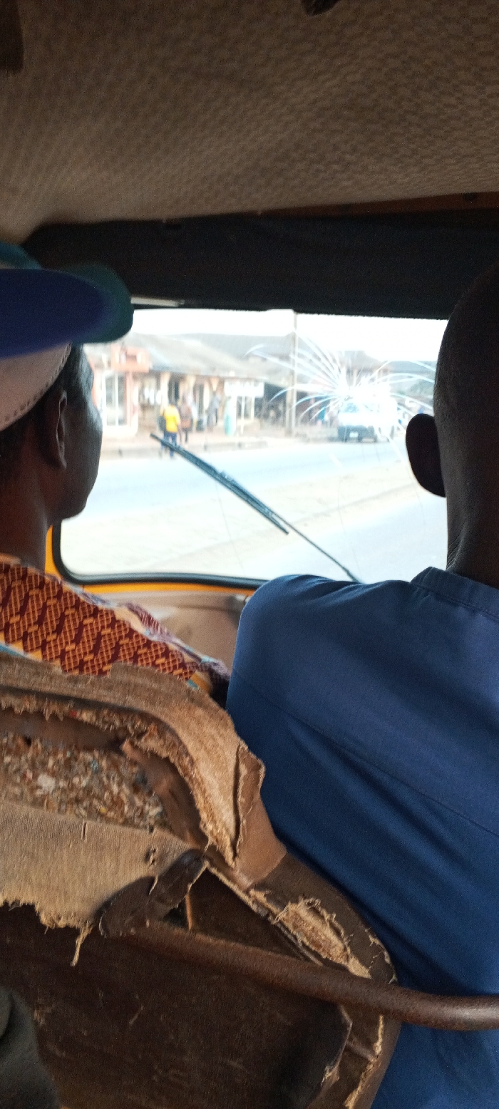 From inside a vehicle, two people are viewed from the back. The person on the left wears a blue cap and patterned shirt. The person on the right wears a blue shirt. Between them is a damaged car seat. Outside, the windshield is cracked. The road is visible with buildings and people on the side. A car is parked in the distance. The scene looks like an everyday moment in a less developed place.