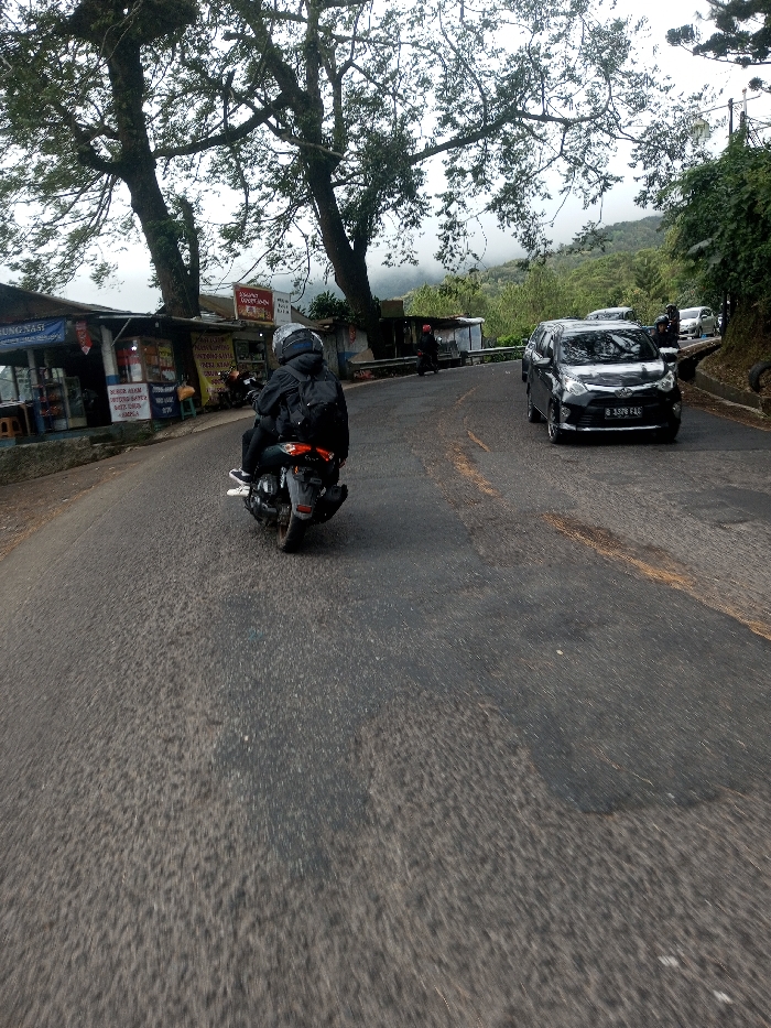 The scene depicts a curved asphalt road in the city of Phoxay, Laos, under an overcast sky. In the immediate foreground, a dark-colored scooter or small motorcycle is ridden by an individual from a rear perspective. The rider wears a black jacket, a black backpack, dark pants, and a white-grey helmet with a dark visor. The road, which appears worn with patches of lighter asphalt, curves to the right and ascends. To the left of the road, a series of rustic roadside stalls or shops are visible, featuring corrugated metal roofs and various signs, including one that reads 'WARUNG NASI'. Large, mature trees with leafy canopies are positioned in front of and between these structures. A figure in a red top is discernible near one of the shop entrances. On the right side of the road, a black multi-purpose vehicle (MPV) with the Indonesian license plate 'B 3378 FAG' is either stationary or moving slowly, facing towards the viewer. Further along the curving road, additional vehicles, including cars and motorcycles, are visible. The background features green, forested hills and mountains partially obscured by mist or low clouds. Dense vegetation lines the right side of the road as it continues its ascent.