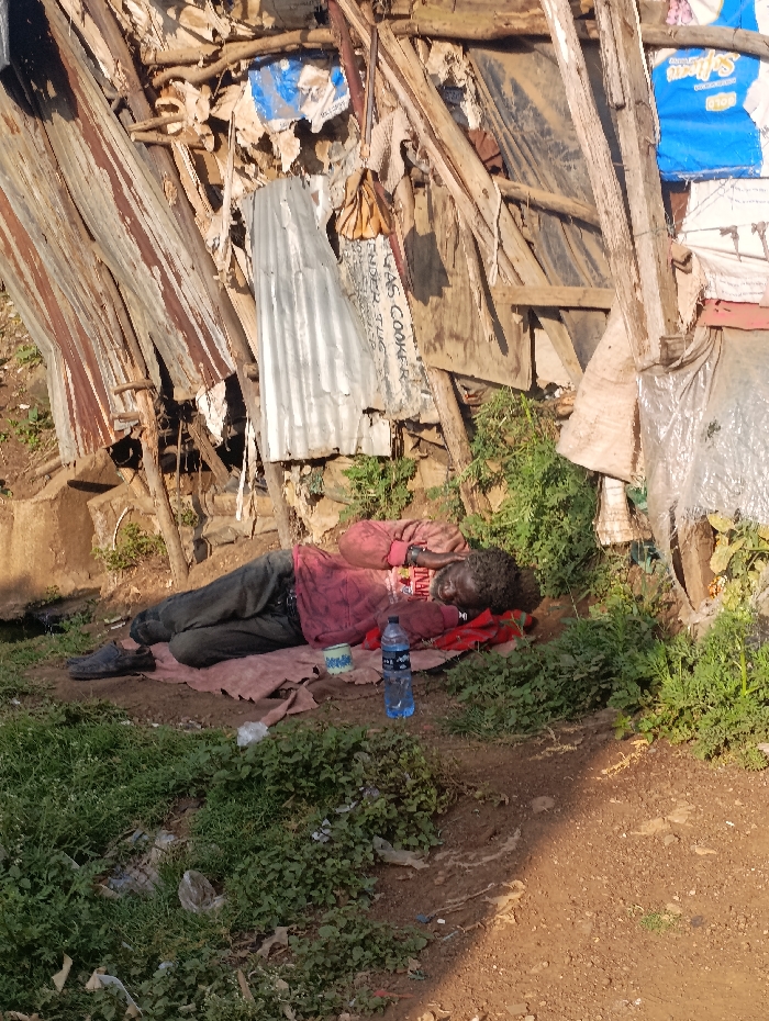 A man lies on his side on a blanket on the ground, near a water bottle. He wears a red shirt and dark pants, appearing to be asleep. The background is a shanty-like structure made of scrap wood, metal sheets, and various materials. There is greenery surrounding the area where the man is resting, along with some litter scattered around. The ground is dirt and grass.