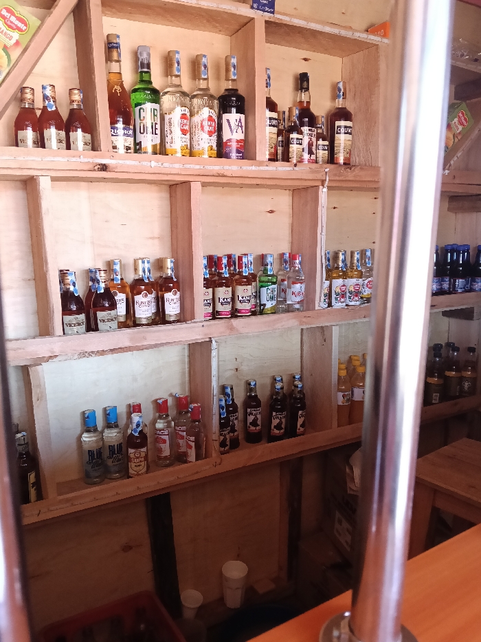 The image displays the interior of a retail establishment, likely a shop or bar, located in Borabu Chitago ward, Kenya