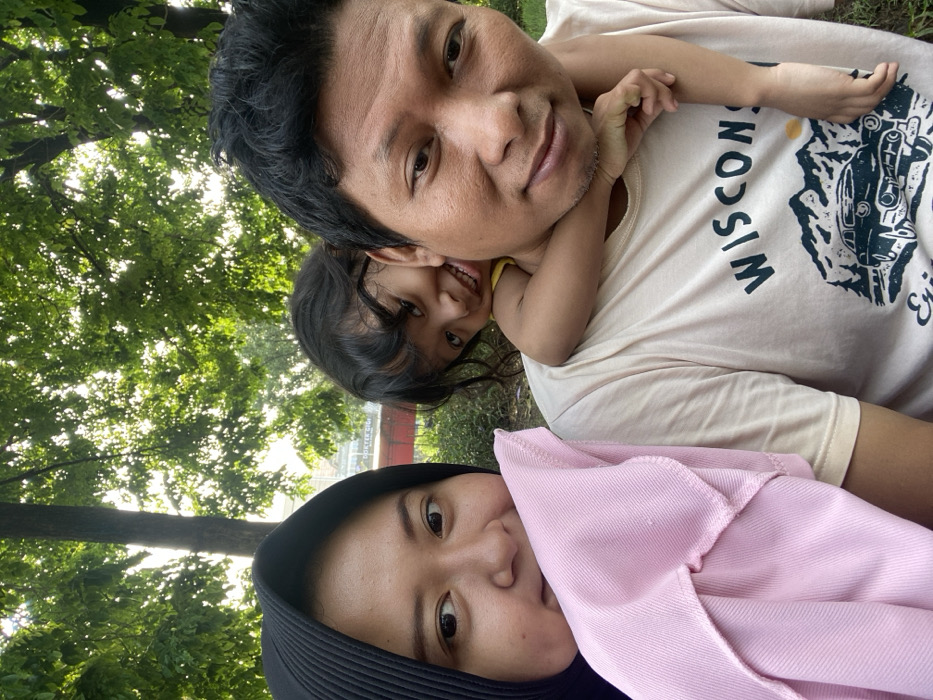A family of three poses for a photo outside with trees and grass in the background. A man in a "Wisconsin" t-shirt is on top with a young child hugging his neck. A woman wearing a black hijab and pink shirt is on the bottom. They are all looking at the camera.