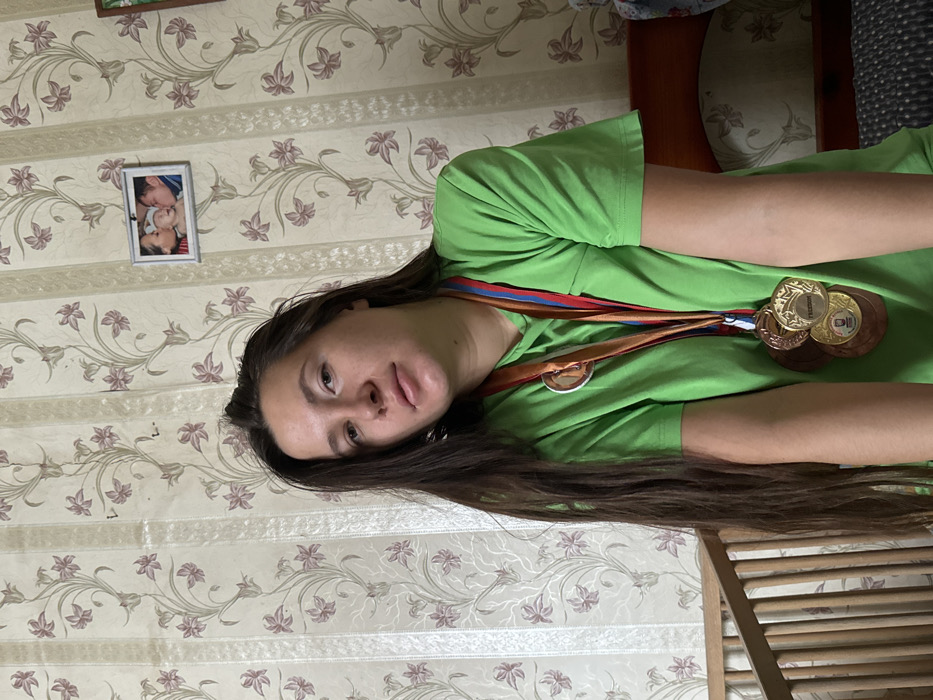 A female individual is depicted indoors in a frontal, chest-up shot within a residential setting in Красный Маяк, Russia. She has long, straight dark brown hair, fair skin, and a neutral expression, looking directly at the camera. The subject is wearing a plain, short-sleeved, bright green t-shirt. Multiple achievement medals are worn around her neck, suspended by ribbons of various colors, including orange, red, and blue. At least five medals are visible, with metallic finishes ranging from gold to bronze tones; one medal features the partial inscription "FREEDOM" and another "WORLD". The background consists of wallpaper patterned with alternating vertical stripes of light cream and a floral design featuring stylized purple/pink flowers and green stems on a light brown/beige base. Minor damage and scuffs are present on the wallpaper. A small framed photograph, showing two adults kissing an infant, is affixed to the wall in the upper right. Partially visible to the subject's left is a light-colored wooden structure with vertical slats, consistent with a crib or bed railing. A darker wooden furniture piece is partially visible to the right.