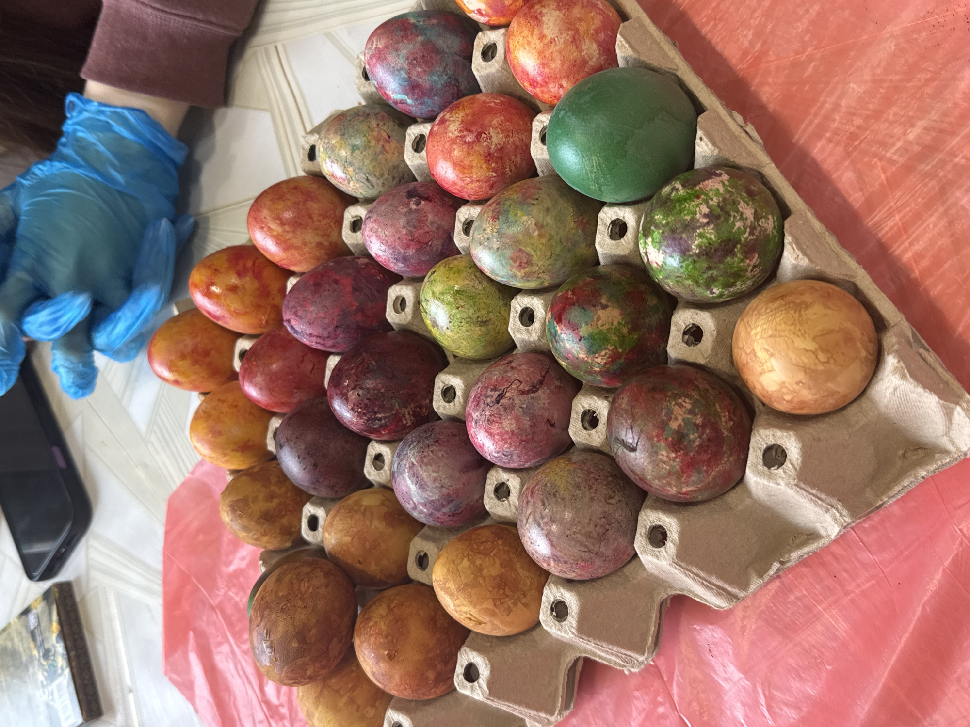 An eye-level, medium shot shows a person wearing blue gloves holding a cardboard egg carton filled with about 30 decorated Easter eggs. The eggs display a variety of colors and patterns, including mottled combinations of orange, red, purple, green, and brown. They are set atop a crinkled pink plastic sheet. To the left of the carton, there is a black smartphone and what appears to be a book cover. The location is likely a home or workspace in an unknown city, but claimed to be Cheshnegirovo, Bulgaria.