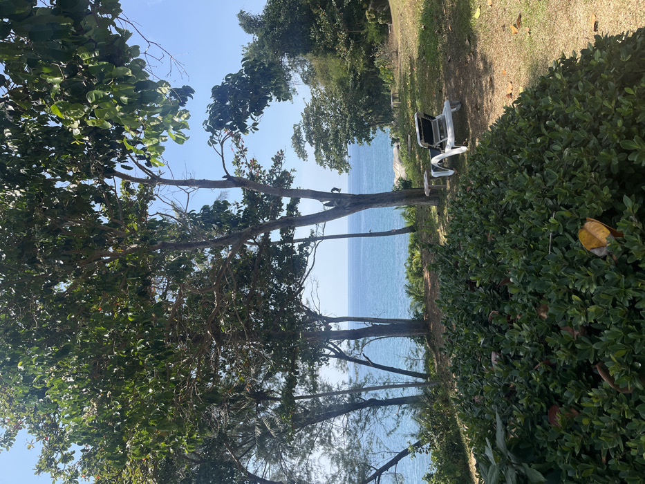 A tranquil scene shows a white bench overlooking a serene, light-blue ocean. The view is framed by lush greenery, including trees with dense foliage on the left and bushes on the right. The sky is a clear, bright blue. The scene is peaceful and inviting, suggesting a relaxing spot with a beautiful ocean vista.