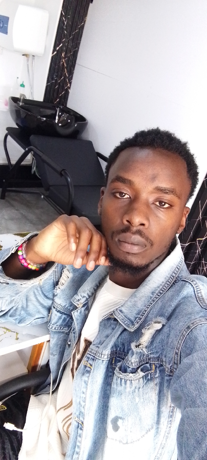 A young, brown-skinned man with short curly hair, a trimmed beard, and a denim jacket poses for a selfie. He wears a white shirt underneath and a colorful beaded bracelet. A black salon sink and chair are visible in the background, along with a white wall-mounted dispenser and a black and white patterned divider. The overall setting appears to be a hair salon.