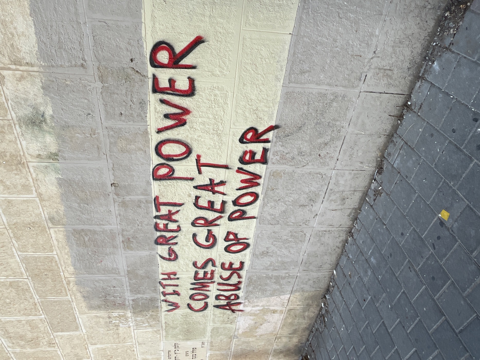 A light-colored stone block wall in Tel Aviv, Israel, exhibits graffiti on a central, cream-colored horizontal band. The graffiti, rendered in red spray paint with black outlines, reads "WITH GREAT POWER COMES GREAT ABUSE OF POWER." The words "POWER" in the first and third lines are distinctly emphasized with red and black. To the left of the graffiti, a small, white rectangular plaque with unreadable Hebrew text is affixed to the wall. The wall shows signs of weathering and discoloration, with some dark streaking visible on the upper left. A grey paver sidewalk, laid in a diagonal pattern, extends from the base of the wall. Minor debris, including small stones and dirt, is present at the junction of the wall and sidewalk, with a small yellow piece of litter resting on the sidewalk. No individuals are visible in the scene, which is illuminated by natural daylight.