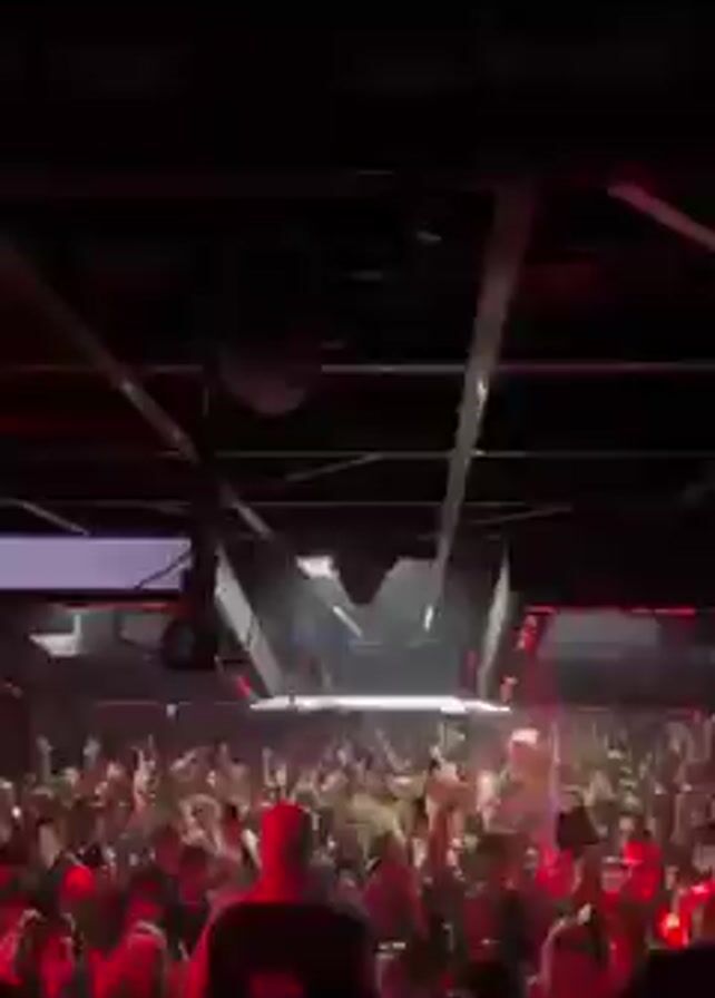 crowded nightclub from the perspective of the DJ. The crowd is dense and facing the stage. The venue has a high ceiling with exposed beams and a disco ball hanging. Lighting is dramatic, switching between bright white and intense red. People are dancing with their hands in the air. The atmosphere suggests an energetic and lively party.