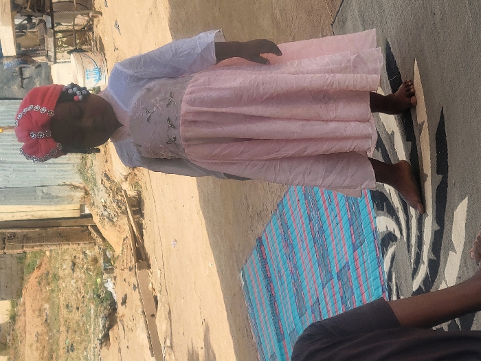 The image depicts a young child standing barefoot on a grey rug with a black and white pattern in Sabojibi, Nigeria
