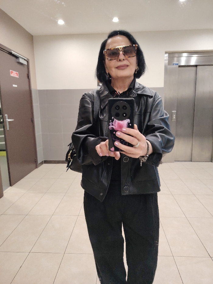An adult female is depicted standing in an indoor hallway, capturing a mirror selfie with a smartphone in her right hand. The location is the city of Ostwald, France. She has dark, short hair and wears large, brown-framed, gradient sunglasses. Her left hand displays a silver-colored ring on the ring finger, and her fingernails are painted a light pink. A dark bracelet is visible on her right wrist, and gold-colored hoop earrings are worn. She is dressed in a black leather jacket, a dark top, and black trousers. A black shoulder bag with gold-colored accents is visible over her left shoulder. The smartphone, held at chest height, has a prominent circular camera module on its black case, which features a pink floral or jellyfish-like design. The background consists of light beige walls above a light gray tiled wainscoting. The floor is covered with light-colored square tiles. To the left, a brown door with a silver handle and a partially visible red sign is present. To the right, a stainless steel elevator door with a call panel is visible. Recessed lighting fixtures are present in the ceiling, illuminating the scene.
