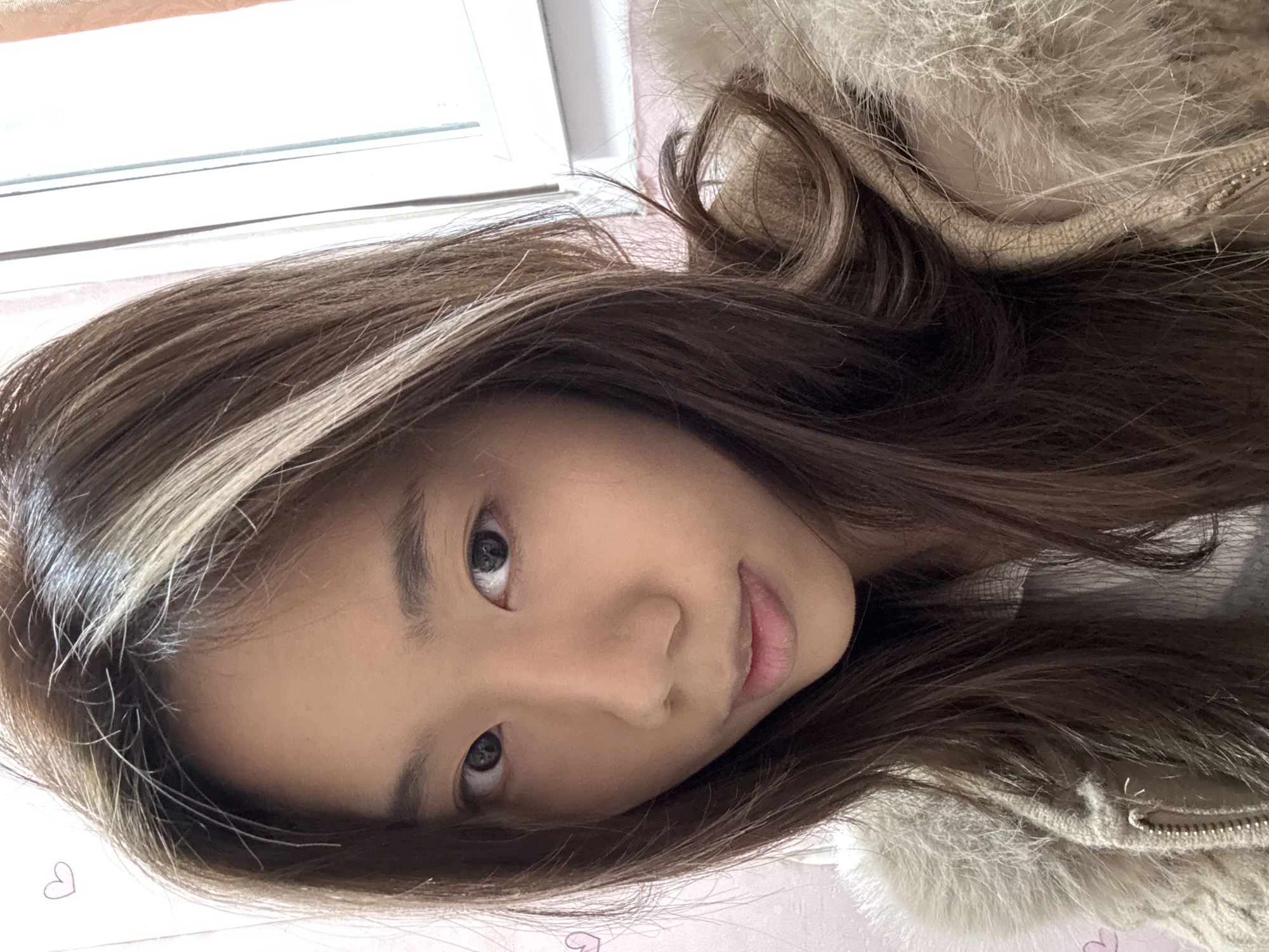 A young Asian woman with brown hair and a blonde highlight is looking at the camera. She has dark eyes and fair skin. She is wearing a beige, fur-trimmed coat or jacket. The background is out of focus, but a window frame is visible at the top of the image, suggesting an indoor setting. There is no information to suggest the image was taken in Shapingba District, China.