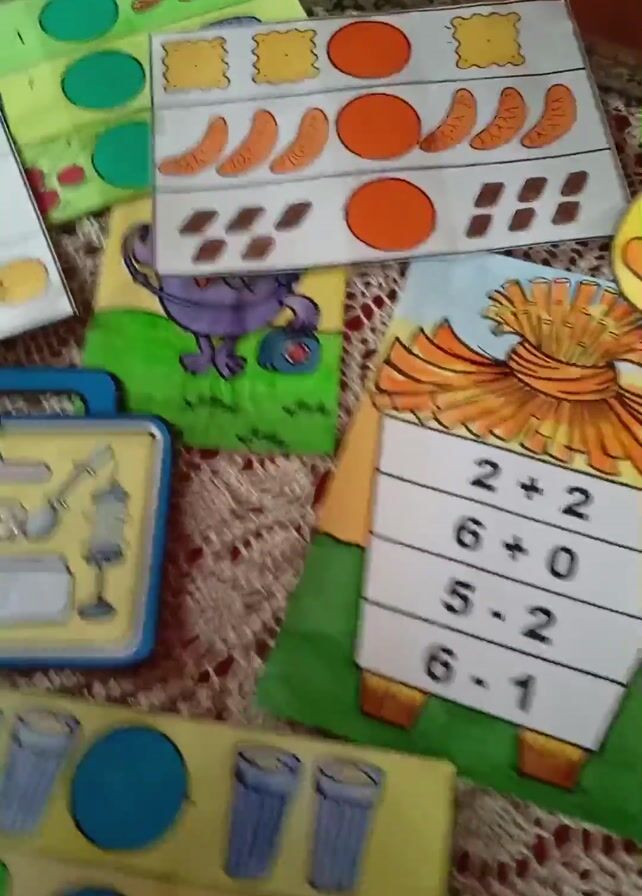 collection of colorful, educational game boards or cards laid out on a table covered with a crocheted tablecloth, with a corner of a patterned rug visible beneath. A hand, presumably belonging to an unseen person, moves through the cards, sorting or arranging them. The cards feature various themes, including counting exercises with images of food items such as strawberries, cookies, oranges, and bananas; simple addition and subtraction problems presented on a scarecrow-themed card; a doctor's kit card; and cards with illustrations of plums, apples, spoons, and glasses with placeholders for matching objects. The overall impression is that these are materials for early childhood education, possibly designed for teaching math or object recognition.