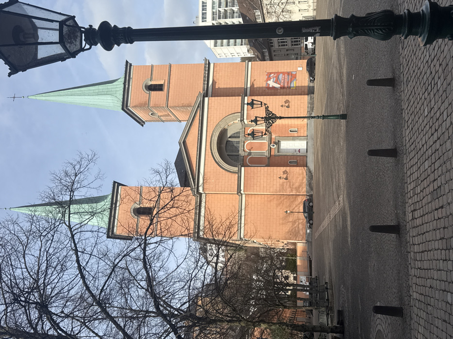 The image displays the Laurentiuskirche (St. Lawrence Church) situated on Laurentiusplatz in Wuppertal-Elberfeld, Germany. The church features a prominent salmon-orange brick facade with two identical, tall rectangular towers. Each tower is capped by a pointed, verdigris green spire, topped with a cross. The central facade includes a large arched recess above a white double door, accessible via a short flight of steps. A red and white banner is affixed to the lower section of the right tower. The foreground is comprised of a cobblestone square. Three dark grey, conical bollards are spaced evenly across the square in the immediate foreground. A multi-headed, ornate dark green street lamp stands centrally in the midground, casting long shadows to the left. Deciduous trees with bare branches are visible on the left side of the square. Several vehicles are present: a dark grey station wagon is parked near the church's left facade. To the right of the church, a black sedan and a white panel van are parked. A modern, white multi-story building is visible in the upper-right background, beyond other less distinct buildings. The sky is clear with minimal high cloud cover. No individuals are present within the scene. The environment is illuminated by low-angle sunlight.