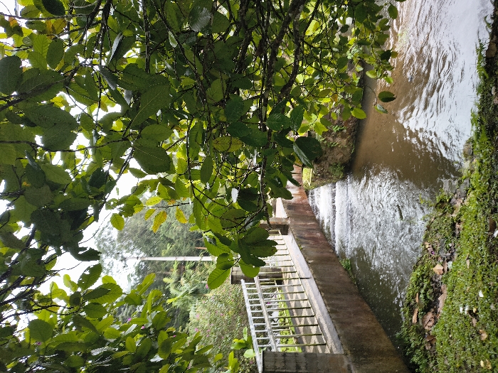 A waterway with a concrete bank flows between mossy edges and a metal-railed bridge. Tree branches and leaves partially obscure the view from overhead. A utility pole rises in the background. The water is flowing swiftly, reflecting the sky. The overall scene is lush and green.
