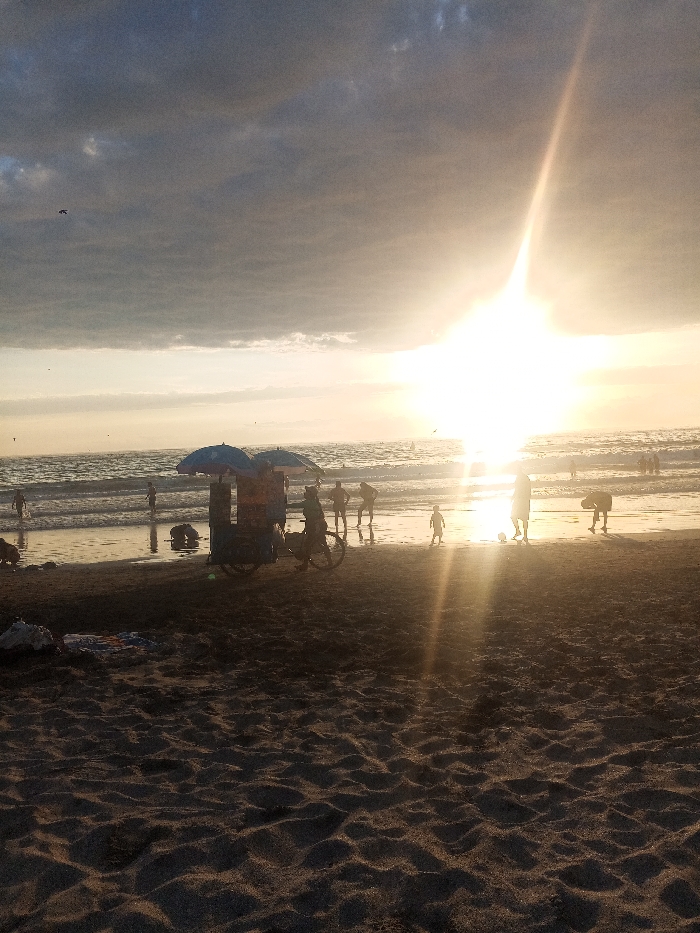 A beach scene at sunset or sunrise, obscured by the intense light. Silhouetted figures of people are scattered along the shoreline. A vendor with a bicycle cart and twin blue umbrellas stands on the left. The sand in the foreground shows patterns of texture. Dark, cloud-filled sky above adds to the striking contrast between light and shadow.