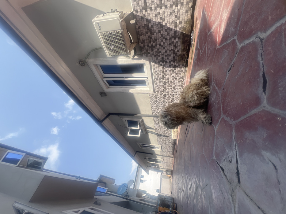 The scene depicts a small, shaggy light brown and white dog lying on its belly on a red, hexagonally patterned paved ground. The dog is positioned in the foreground, facing right, with its head slightly raised and turned towards the left. The setting is an outdoor area between two residential or commercial buildings in Rumuofa, Nigeria, under a bright, clear blue sky with sparse white clouds. To the right of the image, a light grey building with a tiled lower facade features multiple white-framed windows, one with a single pane slightly ajar and another with two panes closed. A "Royal" brand air conditioning unit is mounted on the wall above the tiled section, to the right of a closed window. A black rain gutter runs along the eaves of this building. Shadows are cast from the building onto the paved ground, indicating strong sunlight. To the left, another light-colored building is partially visible, showing blue-tinted windows on an upper floor and a satellite dish mounted on its wall. In the mid-ground, a yellow bucket or hose reel is visible near the left building. A white, block-like object rests on the paved ground near the right building's foundation. The overall environment appears quiet and well-lit. There are no people visible.