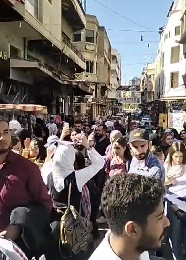 large crowd of people moving along a busy street lined with shops. Many of the people appear to be taking notes or looking at their phones. Most of the people in the crowd are wearing casual clothing, with some women wearing headscarves. The street is narrow and crowded, with people walking close to each other. There are cars parked on the side of the street, and the buildings lining the street are several stories tall. The video is taken from the perspective of someone walking in the crowd.