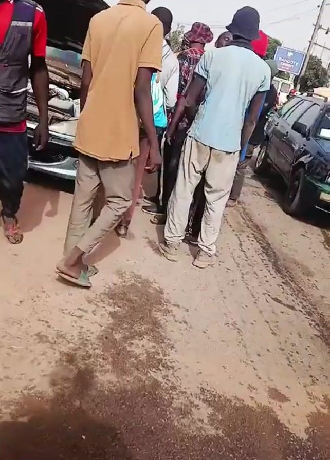 group of people gathered around a light blue Peugeot car with its hood open. The engine compartment appears to have been damaged by fire, with soot and residue visible. The car has a license plate that reads "YAB-285TD." The people are standing on a dirt road, and there is a puddle of liquid on the ground nearby. Some of the people are wearing casual clothing, including sandals. There is a building in the background.