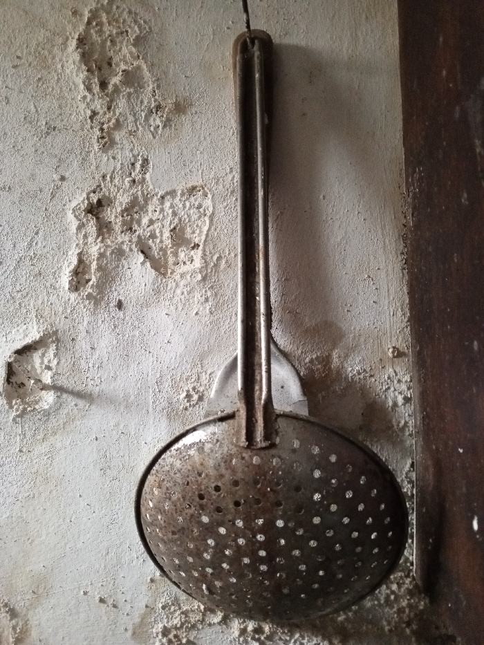 A rusty, metallic skimmer hangs against a weathered wall with peeling paint, showing exposed concrete. The skimmer has a long, slender handle leading to a flattened, circular perforated scoop. To the right, a dark wooden panel is partially visible. The scene evokes a sense of age and disrepair, indicative of a neglected space.