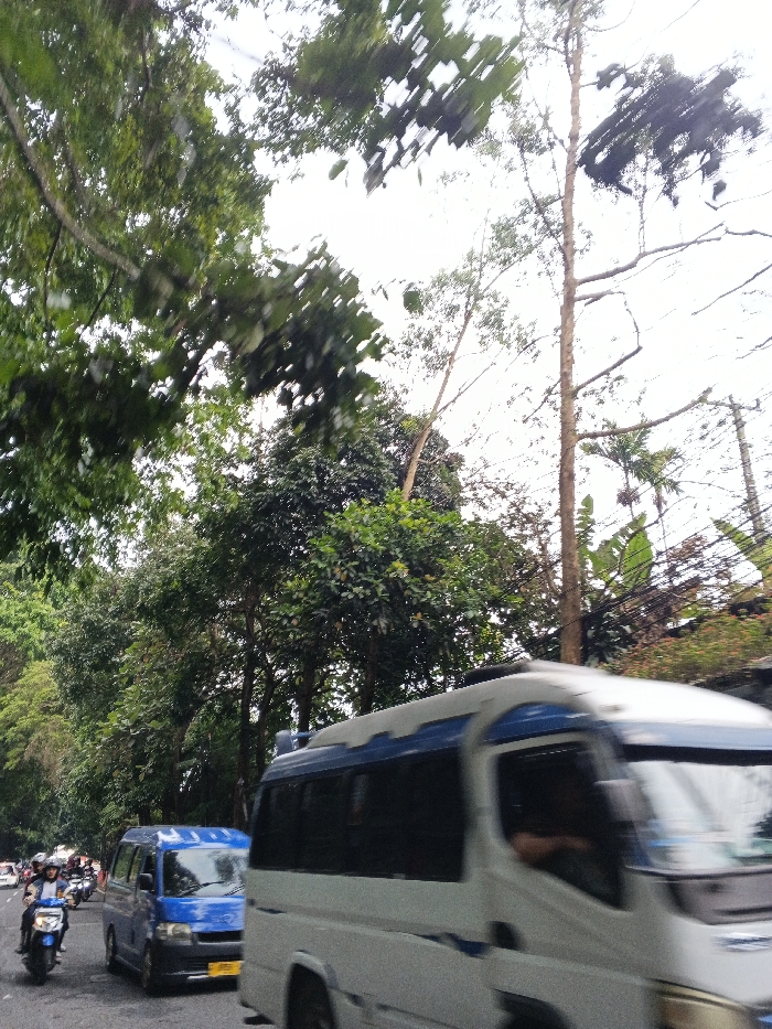 A street scene in Bhimad, Nepal, depicts vehicular traffic on a paved road bordered by dense green foliage under a bright, overcast sky. In the foreground, a white passenger van with blue trim moves from right to left, appearing blurred due to motion, with a driver partially visible through the windshield. Behind it, in the mid-ground, a stationary or slow-moving blue van is visible. To the left, several motorcycles are present; one blue scooter is prominently visible with a rider wearing a helmet and light-colored clothing, positioned to the left of the blue van. Additional motorcycles with riders, also wearing helmets, are visible further down the road in the background, suggesting a queue or group of vehicles. The environment is heavily vegetated with various trees, including tall, slender trunks with sparse branches and dense canopies of green leaves. Utility poles and wires are faintly discernible behind the vegetation on the right side.