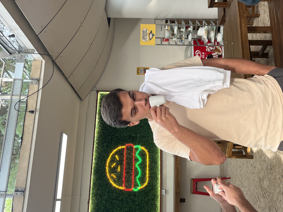 The image depicts an indoor scene within a casual eatery or cafe located in Porto Salvo, Portugal. A young adult male, with short dark hair and wearing a light tan t-shirt and dark pants, occupies the central foreground. A white t-shirt is draped over his left shoulder. He holds a small white espresso cup to his mouth, appearing to drink from it, with his eyes partially closed and directed downward. To the immediate left, the forearms and hands of a second individual are visible, holding another identical small white espresso cup. The background on the left features a large neon sign depicting a hamburger with a yellow bun, red patty, and green lettuce, illuminated against a dark green artificial turf wall. A long wooden counter runs horizontally beneath this display, with a red stool positioned at the far left. The background on the right includes a metal shelving unit displaying multiple white ceramic dishes. Below it, a white freezer bears "Olá" branding. Above the shelving, a yellow sign is visible with Portuguese text, including "OBRIGADO" and "O TEU TABULEIRO!" The ceiling above presents a fluorescent light fixture and a curved architectural panel. Above this, an open area with a metal railing and exposed black electrical wiring is visible, revealing foliage outside. Wooden tables and benches are arranged throughout the visible space, and the floor is light-colored and textured.