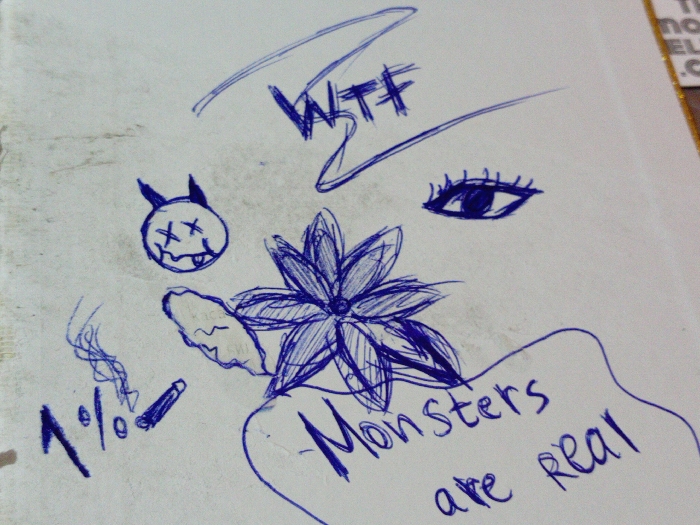 The image displays a close-up photograph of a white paper surface, which exhibits minor smudges and discoloration. Rendered on this paper in blue ballpoint pen ink are multiple distinct doodles and text. In the upper left quadrant, a small, circular, cartoon-style devil face is drawn with two horns, 'XX' for eyes, and an open mouth showing a tongue and jagged teeth. Slightly above and to its right, the capitalized letters "WTF" are scribbled with two diagonal lines crossing them, situated between two horizontal wavy lines. In the upper right quadrant, a stylized human eye with prominent eyelashes is depicted. Centrally, a detailed multi-petaled flower is drawn. In the lower left quadrant, the numerical text "1%" is written next to a drawing of a lit cigarette emitting smoke upwards. In the lower right quadrant, within an irregular, organic-shaped outline, the phrase "Monsters are real" is written in cursive handwriting. A narrow, golden-brown border is visible along the right edge of the paper. The scene is located in Войводино, Bulgaria.