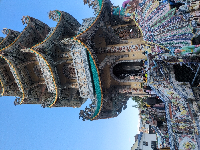 A multi-tiered pagoda-style building, intricately adorned with colorful mosaic tiles, dominates the scene under a clear blue sky in Xuân Thành, Vietnam