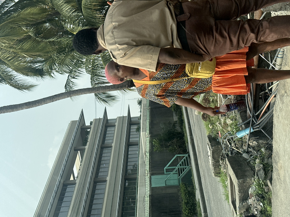 Two people stand near a street with a building in the background. The first person, closer to the camera, has pink hair, wears a patterned orange top, a bright yellow bag, and an orange skirt. They are holding a water bottle. The second person wears a khaki shirt and brown pants. In the background is a tall, modern building with numerous windows, palm trees, and a street. Debris is visible by the roadside.