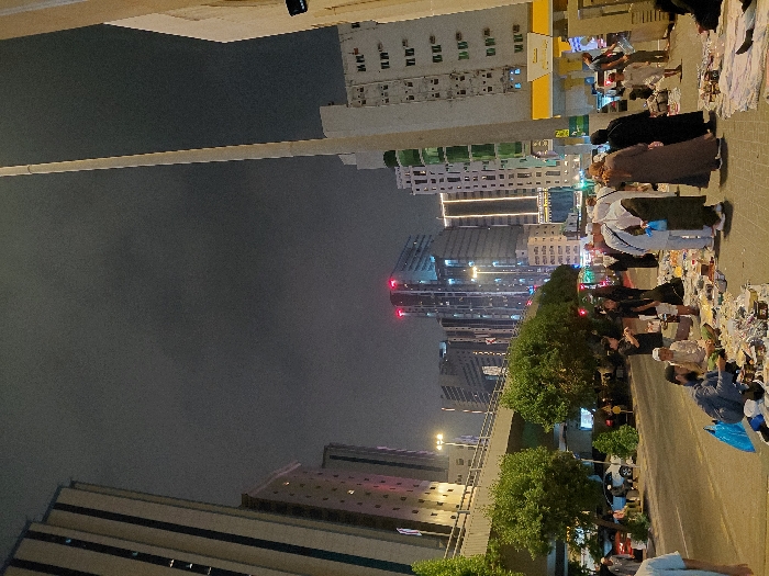 An outdoor market bustles with activity. People in traditional robes browse the stalls, many with items spread on blankets. Tall buildings rise in the background, lit up against the evening sky. Trees line the street, adding greenery to the urban scene. The market is active with people examining goods and shopping.