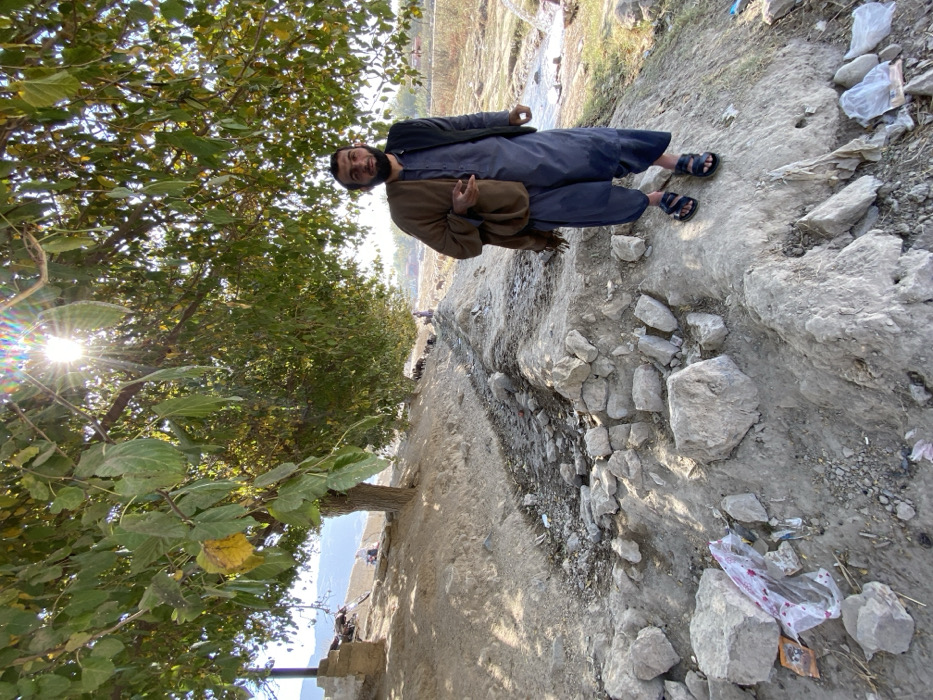 A man in traditional clothing, including sandals, stands on rocky terrain beside a shallow stream. His jacket is brown, and he wears a dark blue robe-like garment. A tree with abundant green and yellowing foliage obscures much of the left side. Sunlight filters through the leaves. The ground is covered with rocks and some litter. The image is rotated counterclockwise.